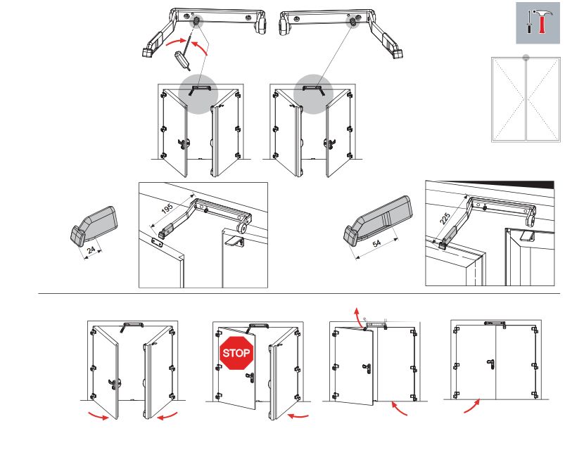 Dverný koordinátor zatvárania dvojkrídlových dverí s požiarnou odolnosťou zaisťuje správne poradie zatvorenia dvojkrídlových dverí v poradí pasívne krídlo a aktívne krídlo. Na obidvoch dverných krídlach je nutné mať namontované samozatvárače.